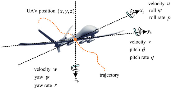 where I represents the moment of inertia of the aircraft, and denote the external moments acting along the body-fixed coordinate system’s axes, respectively. Integration yields the body-fixed coordinate system velocities and angular velocities, shown as