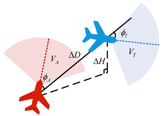 We outline and create these key situational vectors, encompassing crucial details like the positions, velocities, altitudes, and orientations of the unmanned aircraft and other game entities. Specifically, this scenario is designed to simulate a typical airspace encounter where two UAVs—red (the ego UAV) and blue (the target or intruder UAV)—interact in a shared environment. The setup captures key relative motion parameters: distance difference , altitude difference , relative heading angles and , and velocities and . These variables are commonly used in both air combat and collision avoidance contexts. These variables will thoroughly portray the dynamic situation within the game and endow the unmanned aircraft with a complete understanding of the game environment, as illustrated in Figure 3.