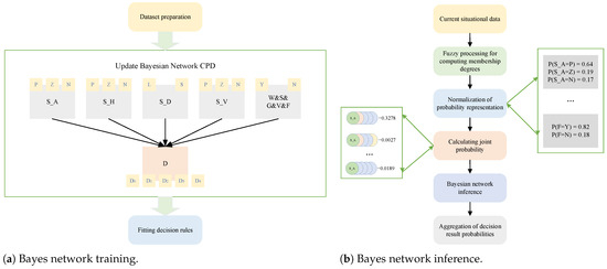 Next, we need to determine the conditional probability distribution tables (CPD) for this Bayesian network. CPDs can be filled in by experts or learned from data. We have constructed a training dataset for network training based on situational information obtained from simulated adversarial experiments and the corresponding maneuver actions. The training process is illustrated in Figure 4a.
