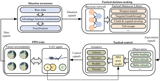 The tactical control component employs the actor network trained by PPO to map observations to UAV control inputs. The complete BVR game workflow entails pre-training the Bayesian network responsible for tactical decision-making and the PPO model responsible for tactical control. The situational awareness component senses and processes situational information. The Bayesian network makes decisions on the optimal tactical actions under the current situation, which are then further decomposed into decision criteria and desired headings, speeds, and altitudes. These constitute observation inputs to the PPO actor network, which ultimately outputs UAV control inputs to execute tactical control.