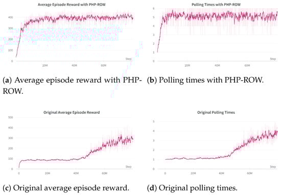 By comparing Figure 8a,b and Figure 8c,d, it is evident that the training curve with the PHP-ROW method converges much faster. The model reaches convergence around the 10 millionth step, whereas without the PHP-ROW method, the convergence is not achieved even by the end of the experiment, with significantly longer exploration times.