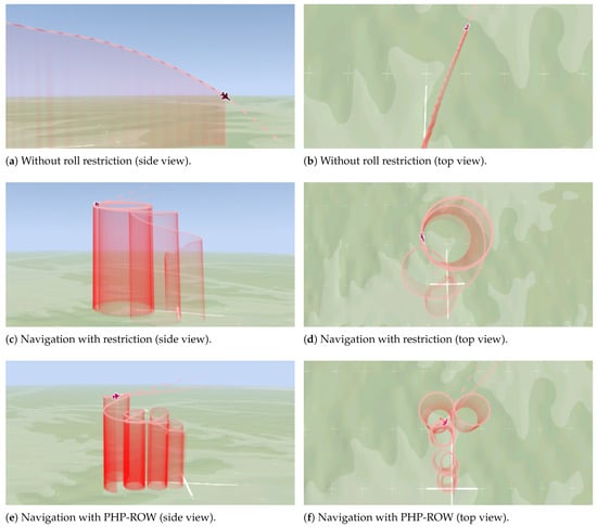 We compared the scenarios of full roll restriction and no roll restriction. Over a total of 200 experiments, we recorded the average number of rolls during level flight for the three models, as presented in Table 4. The model with full roll restriction cannot complete high-curvature turns but maintains smooth flight without frequent rolling maneuvers. Conversely, the model with no roll restriction exhibits rolling maneuvers even during level flight, resulting in lower stability and the potential for speed loss and altitude drop, as illustrated in Figure 9.
