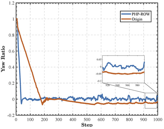 Additionally, to more intuitively demonstrate the significant enhancement in steering maneuverability afforded by the PHP-ROW method, we compared the disparity between the initial heading and the desired heading in the waypoint task between the PPO maneuver control models trained with this method and those without. We employed the ratio of the difference between the actual heading and the desired heading throughout the process to the difference between the initial heading and the desired heading as a normalized metric. As shown in Figure 11, it is evident that the model trained with the PHP-ROW method can stabilize well around the desired value in about 40 steps, whereas the original method requires nearly 200 steps.