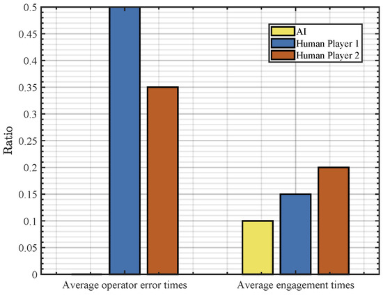 We conducted a beyond-visual-range game experiment across 20 rounds on a high-fidelity simulation platform that utilized real UAV parameters, shown as Figure 12 and Figure 13. During the experiment, we recorded two key metrics: the average number of aircraft crashes caused by operator error on both sides and the average number of crashes resulting from engagements, shown as Table 5 and Figure 14. The results demonstrate that, in the course of the engagement, AI was capable of executing directional breakthrough maneuvers in the initial phase, transitioning to climb and expand maneuvers upon detecting the target, and ultimately launching missiles and performing biased guidance upon entering the attack zone. In contrast, human players exhibited unstable UAV control and lower efficiency in executing tactical maneuvers, making it challenging to strike a balance between weapon deployment and missile evasion.