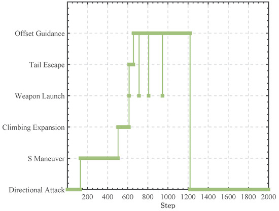 We have documented the maneuver decisions made by the Bayesian network at different moments during one round of the AI–human adversarial game, as shown in Figure 15. It is observable that the initial stage tends to favor direct breakthrough maneuvers. After a period, it executes S maneuvers to search for the target. Upon target discovery, it carries out a climbing envelopment maneuver to complete attack positioning. When attack conditions are met, it conducts weapon firing and biased guidance. This process is repeated multiple times. During execution, when faced with threats from enemy missiles, it performs evasion maneuvers. After annihilating the target, it continues with direct breakthrough maneuvers until the round concludes.