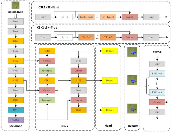 YOLOv11 [15], released by Ultralytics on 30 September 2024, is the latest object detection algorithm, achieving significant improvements in accuracy, speed, and multi-task processing capabilities compared to previous YOLO models. The architecture primarily consists of a backbone network, a neck network, and a detection head, as illustrated in Figure 4.