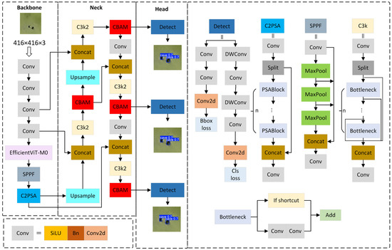 In response to the aforementioned challenges and research gaps in this field, this study proposes a lightweight detection framework based on an improved YOLOv11 algorithm. YOLOv11 stands as a state-of-the-art real-time object detection model in the fields of deep learning and computer vision. As the latest iteration of the YOLO series, this architecture not only preserves the fundamental advantages inherited from previous generations but also introduces groundbreaking technical innovations and systematic improvements. Through optimized network architecture and enhanced feature extraction mechanisms, YOLOv11 achieves marked improvements in detection accuracy, model versatility, and computational efficiency, while maintaining exceptional inference speed critical for real-time applications [14]. The framework addresses existing challenges through two levels of technological innovation: first, by replacing the original backbone network of the baseline YOLOv11n with EfficientViT, optimizing the feature extraction and fusion mechanisms; second, by introducing the Convolutional Block Attention Module (CBAM) into the neck network to enhance the model’s ability to recognize small targets in complex backgrounds [8]. The main objectives of this study are as follows: