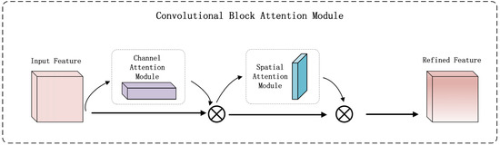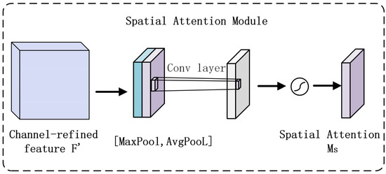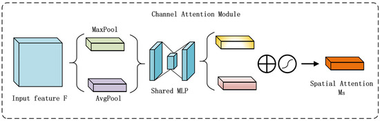 The CBAM (Convolutional Block Attention Module) attention mechanism is a lightweight module that integrates channel and spatial attention, designed to enhance the model’s feature representation capability by dynamically adjusting channel-wise and spatial weights of feature maps [19]. The architecture of CBAM is illustrated in Figure 7. CBAM consists of two submodules, SAM (spatial attention module) and CAM (channel attention module), as shown in Figure 8 and Figure 9, performing spatial and channel-wise attention, respectively.