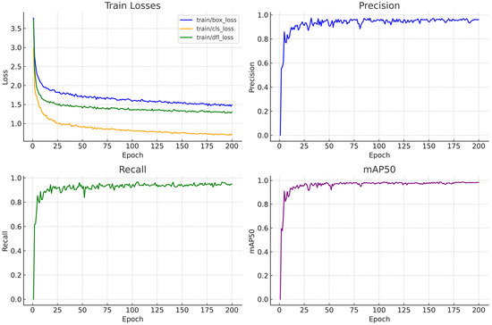 The trend of various precision metrics during model training is shown in Figure 10. In the first 50 epochs, the model’s precision and recall increase sharply, while the loss value decreases. After 100 epochs, the precision and recall metrics stabilize, indicating that the model is approaching its optimal performance. By the end of 200 epochs, the slopes of the accuracy curves for the YOLOv11 model approach zero, and the loss values reach their minimum, signifying model convergence. Training is concluded at this point to prevent overfitting.
