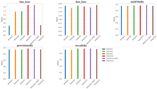 To evaluate the effectiveness of the proposed YOLOv11-AEIT model, a comparative experiment was conducted against YOLOv5, YOLOv8, YOLOv9, and the baseline YOLOv11. The results demonstrate that YOLOv11-AEIT achieves the highest detection performance, with an mAP@0.5 of 98.6% and an mAP@0.5:0.95 of 55.3%, surpassing all other models. Compared to YOLOv11, the improved model enhances mAP@0.5 by 3.5 percentage points and mAP@0.5:0.95 by 1.4 percentage points, indicating its superior ability to detect small and low-contrast pika burrows. Although the inference speed of YOLOv11-AEIT (49.5 FPS) is slightly lower than that of YOLOv11 (51.2 FPS), the marginal trade-off in speed is justified by the significant boost in accuracy. These results confirm that the proposed model effectively addresses the challenges of pika burrow detection, achieving a more robust and precise detection performance. In the marmot burrow detection task, the performances of YOLOv5, YOLOv8, YOLOv9, YOLOv11, and the newly introduced YOLOv12 algorithms are compared, as shown in Figure 13.