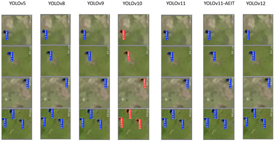In comparison, the YOLOv11-AEIT model significantly improves the detection of plateau pika burrows, especially the smaller ones, with more accurate bounding box placements and fewer misdetections. This enhancement is particularly noticeable in detecting small burrows, with improved recall and precision, achieving a recall rate of 96.1% and an inference speed of 49.5 FPS. While some misdetections still occur, particularly in cases of partial occlusion or low-contrast areas, the overall performance in both small- and large-burrow detection surpasses previous YOLO versions, showcasing the strength of the EfficientViT and CBAM modules integrated into the YOLOv11-AEIT model (Figure 14).