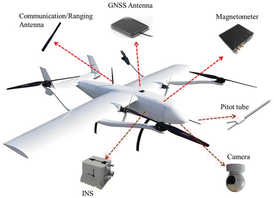 For unmanned systems, the navigation system is of great significance. Generally, an integrated navigation system composed of sensors such as GNSS receiver and Inertial Navigation Systems (INSs) provides unmanned systems with information on position, velocity, and attitude. In particular, unmanned systems operating in large-scale outdoor environments (e.g., UAVs, UGVs, and USVs) rely on a GNSS-based navigation system to obtain absolute position information [,,,,]. For example, a UAV is equipped with a variety of navigation sensors such as INSs, satellite navigation, magnetometer, barometer, and ranging sensor to provide it with multi-source navigation information, as shown in the Figure 1.