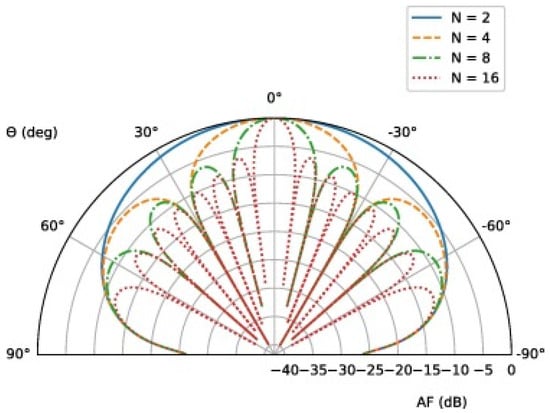 Figure 3 shows a layout diagram of an 8-element GNSS anti-interference antenna. Figure 4 shows the antenna array factor for a different number N of array elements.
