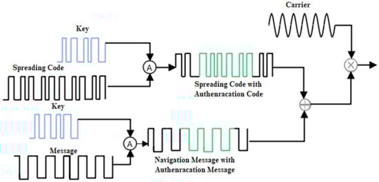 Satellite navigation signals consist of three components: carrier waves, pseudorandom codes, and navigation messages. The newly added authentication markers can be embedded in either the navigation messages or the spread spectrum codes, leading to two distinct authentication approaches: Navigation Message Authentication (NMA) [] and Spread Spectrum Code Authentication (SCA) [], Figure 5 shows the schematic diagram of them.