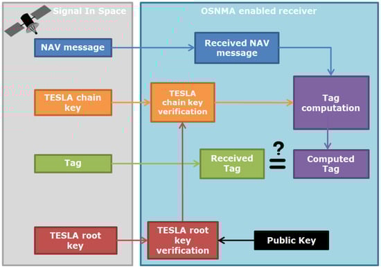 NMA implements navigation source authentication through bit-level message verification, offering three principal advantages: compatibility with existing signal infrastructures requiring minimal hardware modifications, preservation of legacy modulation schemes through receiver software upgrades, and cost efficiency with deployment costs lower than hardware-based solutions. The Galileo E1 OSNMA processing logic is shown in Figure 6.