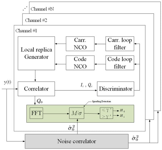 The relative motion between the satellite and the receiver causes Doppler shifts in both the carrier frequency and the spreading code of GNSS signals. Genuine satellite signals exhibit consistent Doppler shifts between the carrier and spreading code, maintaining a fixed proportion. Simple spoofing sources may fail to maintain this proportion, enabling detection through consistency checks []. Once a receiver locks onto a genuine satellite signal and establishes a position fix, it can predict the next doppler shift based on the receiver and satellite motion. By comparing the predicted value with the measured value, spoofing interference can be identified when the deviation exceeds a predefined threshold [,,]. For example, Li et al. proposed a spoofing detection method called the Q-channel signal component (QSC), as shown in Figure 8; the basic idea is to exploit the spoofing-induced feature by transforming the correlator output into the frequency domain [].