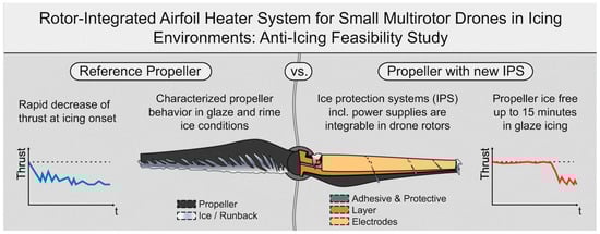 - Karpen, N.; Diebald, S.; Dezitter, F.; Bonaccurso, E. Propeller-Integrated Airfoil Heater System for Small Multirotor Drones in Icing Environments: Anti-Icing Feasibility Study. Cold Reg. Sci. Technol. 2022, 201, 103616. [Google Scholar] [CrossRef]
