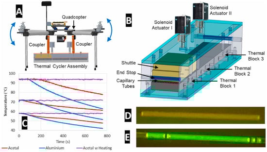 | In-flight PCR Diagnostics | Thermal cycling with high-temperature denaturation (~94 °C) and lower temperatures for annealing/extension | [28,29] |