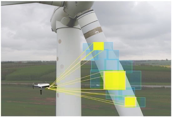 Due to the large number of waypoints and the requirement to accurately collect data from the entire surface of the inspected object, it is necessary to strike a balance between efficiency and precision. Taking the inspection of complex structures, such as wind turbine blades, as an example, traditional methods require planning a large number of waypoints to ensure comprehensive observation of the object’s surface []. This study defines the ratio of the observed surface to the total surface area of the object as the coverage ratio. Increasing the coverage ratio often leads to prolonged flight durations and higher energy consumption for UAVs, thereby limiting the number of devices that can be inspected within a single takeoff and landing cycle and reducing overall inspection efficiency. Here, inspection efficiency refers specifically to the operational throughput determined by waypoint count: fewer waypoints shorten flight paths, reduce mission time and energy consumption, and thus allow more inspection tasks per takeoff–landing cycle. Moreover, the complex shapes of the inspection objects and the small size of the defects make it difficult to achieve clear observation of critical defects.