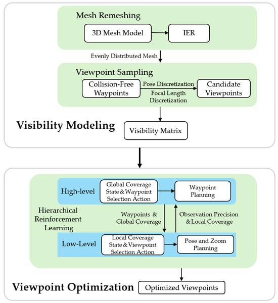To this end, this study proposes a viewpoint planning method based on hierarchical reinforcement learning, denoted as HRL-SPVP (Hierarchical Reinforcement Learning for Scalable Precision Viewpoint Planning). The proposed algorithm comprises two primary stages: visibility modeling and viewpoint optimization, as depicted in Figure 3. In the visibility modeling stage, the inspection object’s 3D model is preprocessed using an Isotropic Explicit Remeshing (IER) method [], which reconstructs and remeshes the original model. This preprocessing step facilitates subsequent visibility calculations and simplifies the determination of the inspection object’s surface area. A set of candidate viewpoints is then sampled in space and their visibility relative to the surface of the inspection object is computed. In the viewpoint optimization stage, the visibility information obtained is utilized to optimize viewpoint selection, aiming for complete surface coverage and high-precision observation of the object. To meet the objectives of complete coverage, observation precision, and waypoint minimization, the viewpoint planning problem is framed as an optimization task. Hierarchical reinforcement learning decomposes the viewpoint planning process into two levels: high-level waypoint planning and low-level pose and zoom planning. This approach effectively decouples the complex interdependencies between waypoint position, viewpoint poses, and focal lengths. The high-level waypoint planning strategy selects the optimal waypoint positions from the candidate set to ensure full surface coverage with minimal waypoints, while the low-level pose and zoom planning strategy fine-tunes the viewpoint poses and focal lengths at each waypoint to satisfy the required observation precision.