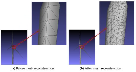In the visibility modeling process, this study employs the IER (Isotropic Explicit Remeshing) method to remesh the model, achieving a uniform distribution of surface meshes with consistent mesh shape and area. This not only establishes the foundation for subsequent visibility calculations, but also simplifies the computation of the inspection object’s surface coverage area. An example of the model before and after mesh reconstruction is shown in Figure 4.