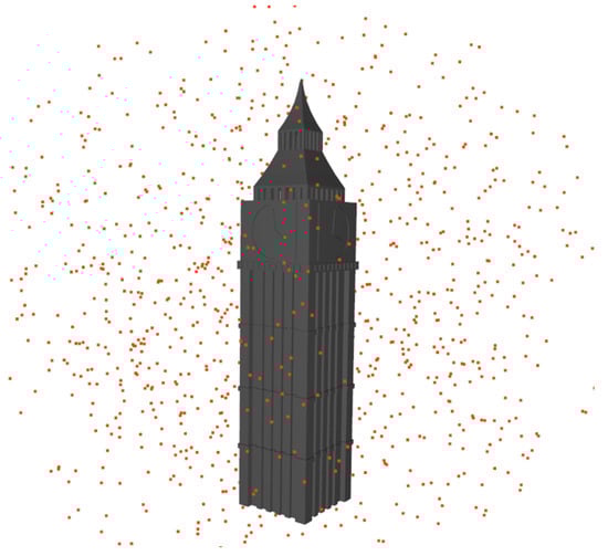 First, uniformly distributed candidate waypoints are generated in the surrounding space of the inspection object. In this study, random sampling is conducted in the region around the inspection object. After obtaining the initial set of candidate waypoints, collision detection is performed to ensure that the distance between each waypoint and the surface of the inspection object is greater than the minimum safety distance . The waypoint sampling results after collision detection are shown in Figure 6.