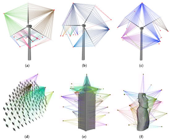 Waypoint Spatial Location Visualization. (a) Inverted Y—shaped for turbine blades. (b) Horizontal state of turbine blades. (c) Upright Y—shaped structure for turbine blades. (d) SolarPlant. (e) Big Ben. (f) Hoa Hakananai’a.