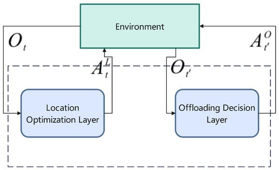 The two layers share portions of the environment state (e.g., battery levels, user locations, task demands), but are trained separately, each optimizing its respective sub-objective. This design reduces the overall complexity of joint optimization and improves training efficiency.