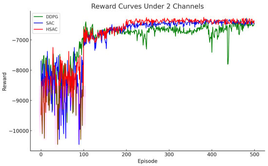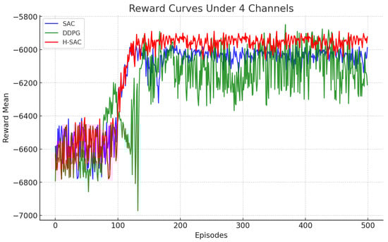 When , all algorithms exhibit similar convergence trends. H-SAC achieves a slightly higher final reward but the improvement is modest due to the limited parallelism. In contrast, for , H-SAC demonstrates faster convergence and higher final rewards, showing a clear advantage in leveraging multi-channel capacity via coordinated trajectory and offloading decisions.