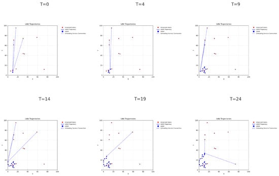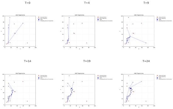 Each figure consists of a sequence of six snapshots selected from the simulation window spanning time slots to , with one snapshot approximately every four time slots. Here, T denotes the index of the decision-making time slot. The UAV’s motion trajectory and the offloaded users at each time step are visualized to reflect the spatio-temporal decision pattern of the agents. (In the figures, the solid blue lines represent the UAV’s movement trajectory, while the dashed blue lines indicate the UAV’s user selection decisions. Red circles denote the positions of the users, and blue squares mark the UAV’s discrete movement points).