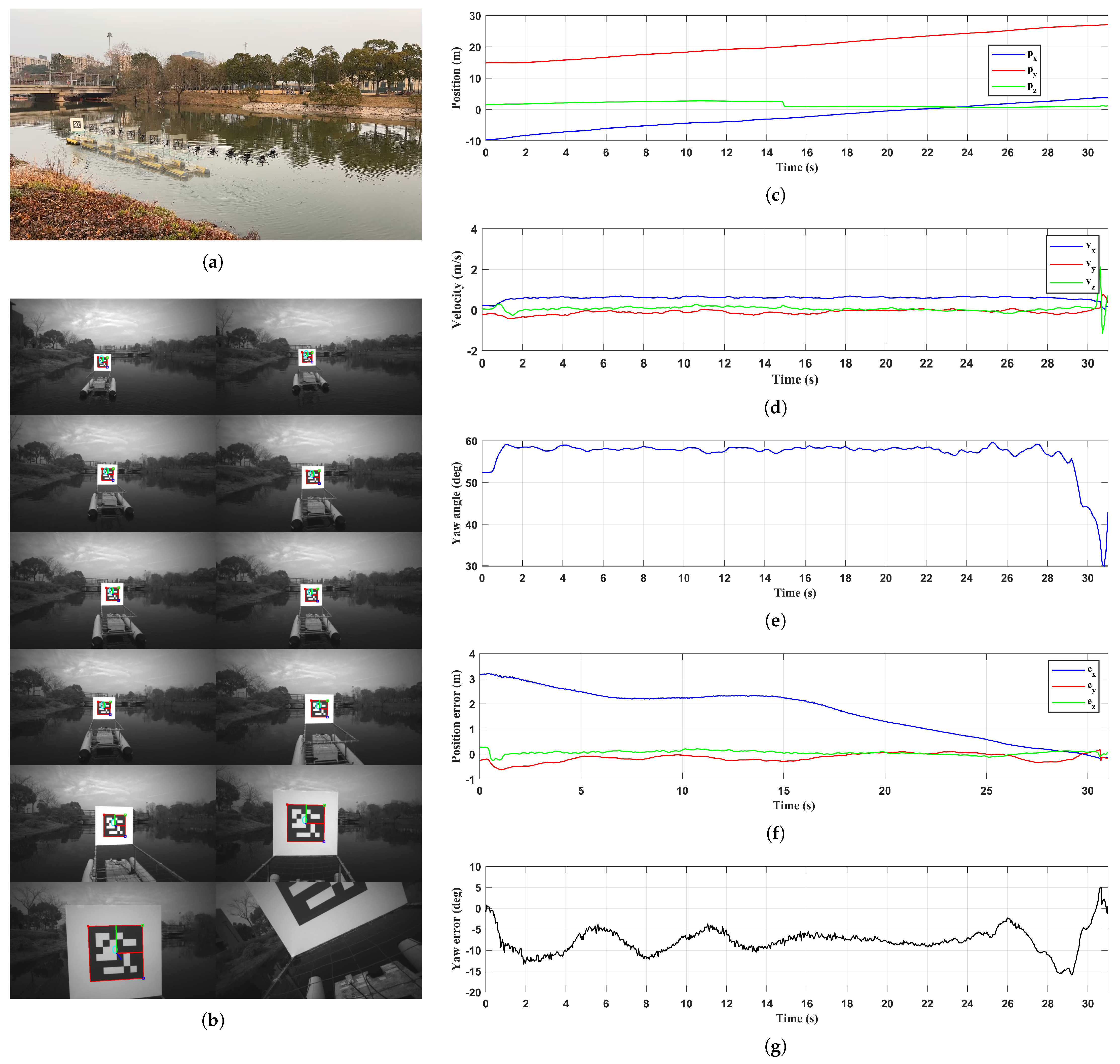 - Based on a small USV adapted for operating in narrow rivers, a landing platform with a vertically placed fiducial marker is designed to separate the UAV landing area from the fiducial marker detection region in order to mitigate the interference from lighting and shadows on the fiducial marker. Additionally, an event-triggered visual guidance and control method is introduced to enhance UAV stability by optimizing heading and position control during the autonomous landing process.