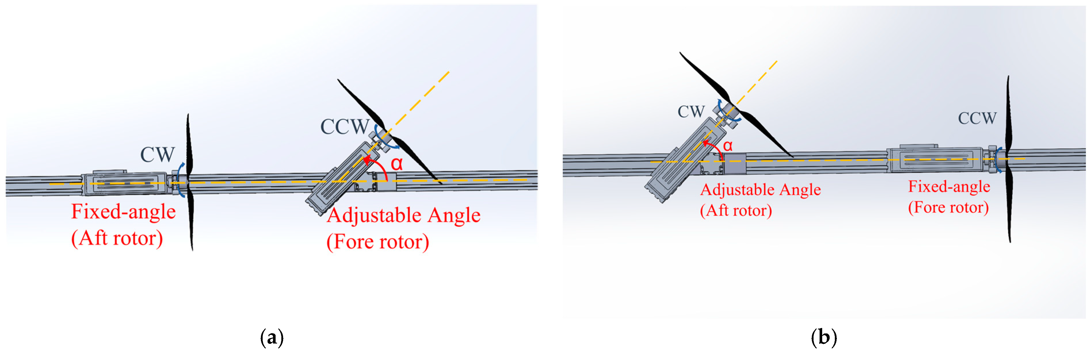 23] explored the aerodynamic noise of tandem rotors. Asynchronous tilt-rotor configurations for the distributed electric tilt-rotor UAVs are also a promising option. However, most of the current research focuses on synchronized tilt tandem dual-rotor configurations, with limited studies on the aerodynamic performance of tandem rotor systems in asynchronous tilt states. Therefore, this paper primarily investigates the changes in aerodynamic performance of the tandem dual-rotor system in the asynchronous transition process of the tilt-rotor UAV. Using a custom-designed aerodynamic performance testing platform for tilt dual-rotor systems, the study measured performance indicators such as thrust, torque, and power variations with changes in rotor tilt angle and rotational speed for a reverse rotating rotor model with fixed axial distance. Additionally, the impact of aerodynamic interactions between the fore and aft rotor disks on the multi-rotor system’s performance was analyzed. It should be noted that due to the varying incoming flow velocities for rotors at different tilt angles in the forward flight state, conducting an experimental design is challenging. However, the influence of tilt angle on the aerodynamic forces of the tandem rotor system without incoming flow remains of significant reference value. Therefore, the entire experimental process was conducted under no incoming flow conditions.