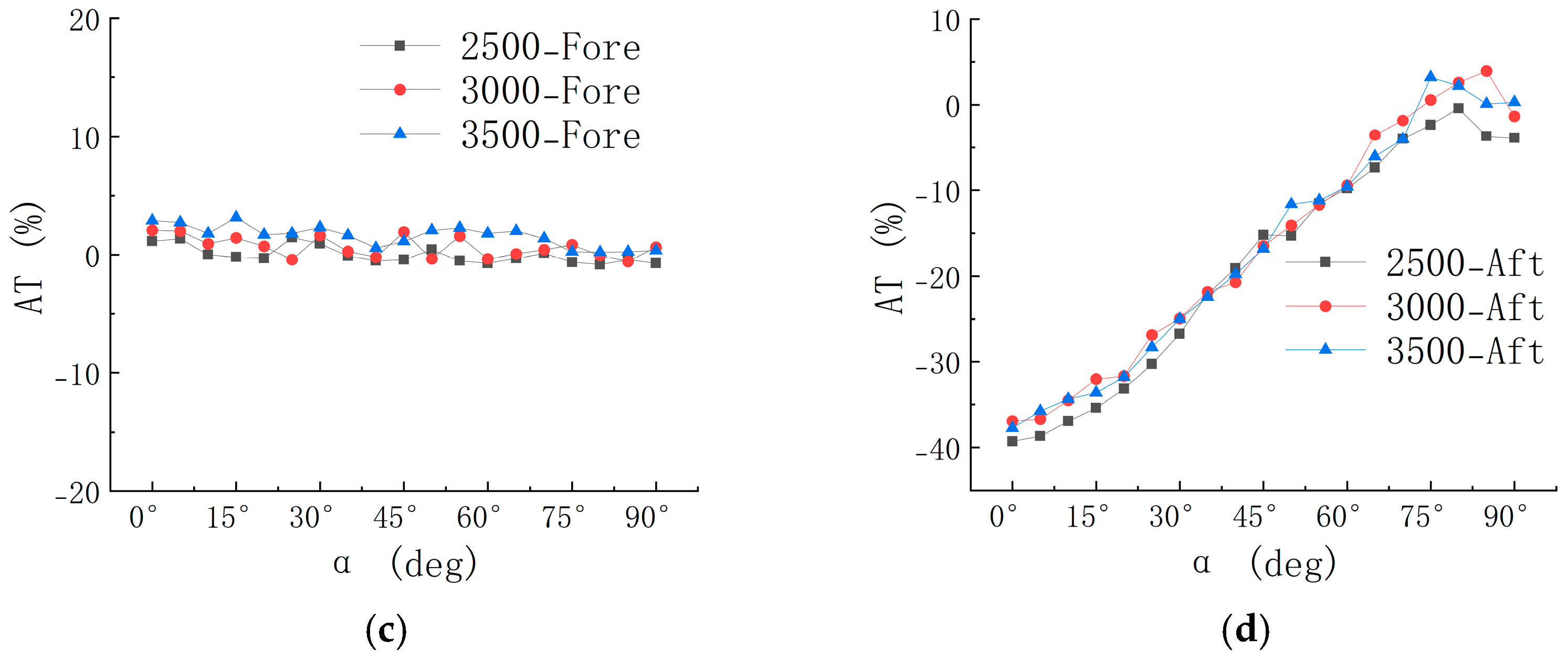 Figure 15d presents the aft rotor thrust variation under aft tilt conditions, showing a trend similar to that observed in the forward tilt case. This further confirms that rotor speed has only a limited impact on rotor-to-rotor aerodynamic interference under these testing conditions.