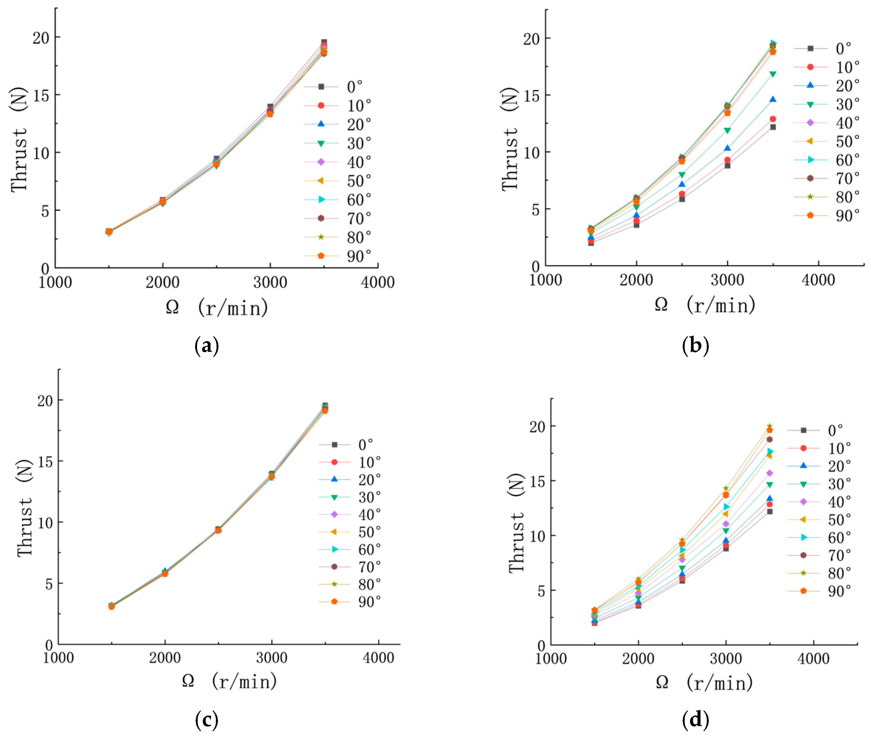 Figure 6a,c, the thrust of the fore rotor remains largely unaffected by the tilt angle, with no significant losses observed. This is attributed to the absence of additional flow disturbances in the test environment other than the rotor-induced airflow, as well as the relatively large spacing between the fore and aft rotors, which minimizes the impact of tilt angle on the fore rotor. These findings are consistent with the experimental results reported by Zanotti [
