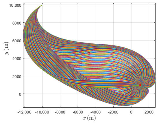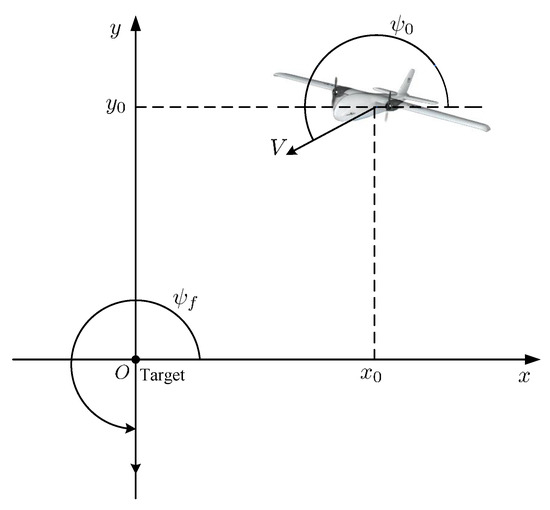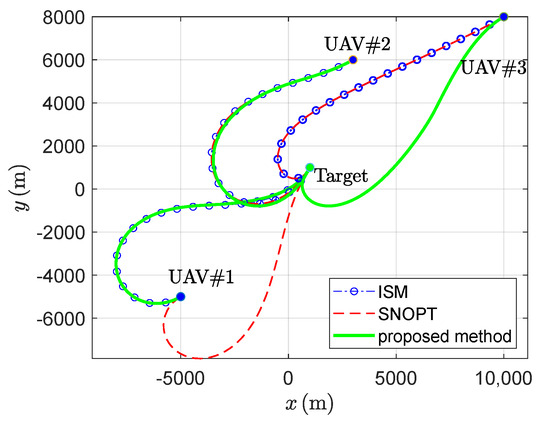 Consider a scenario in which three UAVs are required to be guided to a desired position simultaneously. Without loss of generality, the target is considered to be located at m. Note that the position of the target can be arbitrarily chosen through coordinate translation. For notational simplicity, let us use UAV to denote the ith UAV among the three UAVs, and let be the expected final control for UAV . The values of , , are set as m/s2, 5 m/s2, and 0 m/s2, respectively. All three UAVs are required to reach the common target at s with the final heading angle being . The initial conditions for the three UAVs are summarized in Table 1.