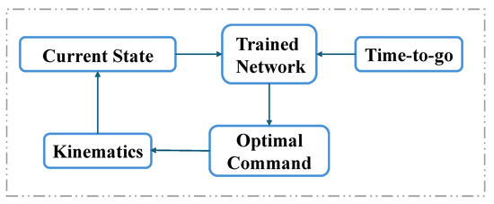 In Algorithm 1, , T, and are set as 20, 1 and 0.02, respectively. The resulting dataset contains approximately elements. These data are randomly divided into training, validation and test subsets in an 8:1:1 ratio and used to train an MLP that has three hidden layers, each with 30 tanh-activated neurons and a single output. The MLP is implemented in TensorFlow 2.1 (Google LLC, Mountain View, CA, USA) and trained for 10 epochs with a batch size of 1024, using the Levenberg-Marquardt optimizer to minimize the mean-squared-error loss; an early-stopping criterion terminates training once the loss drops below . For any given as input, the trained neural network takes around to generate the output on a desktop PC equipped with an AMD Ryzen 5 3600 6-Core Processor at 3.60 GHz (AMD Inc., Santa Clara, CA, USA), 16 GB RAM, and Windows 10 Pro 64-bit (Microsoft Corp., Redmond, WA, USA). This indicates the trained neural network can generate the optimal control command within a small period of time, which is enough for onboard applications.