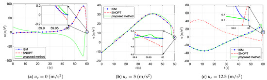 The trajectories generated by the proposed method are illustrated as solid green curves. The trajectories produced by SNOPT are shown as red dashed lines, while those generated by ISM are represented by blue dashed lines. These trajectories can be found in Figure 3. The time histories of the corresponding controls are presented in Figure 4. Let , and denote the control effort required by SNOPT, ISM and the proposed method, respectively. Then, the values of , and for the three UAVs are presented in Table 1.