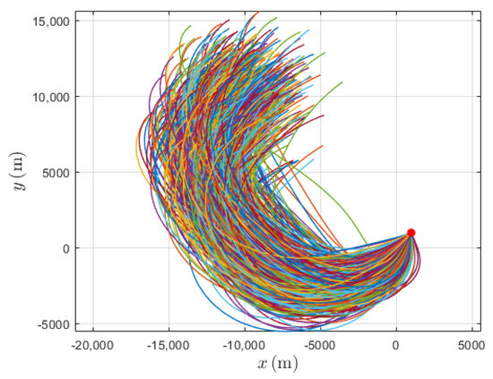 To demonstrate the robustness of the proposed method, a Monte Carlo test is implemented by disturbing the initial conditions. In this Monte Carlo test, 1000 initial conditions are randomly selected. To be more specific, the initial values , , and are randomly selected within the intervals km, km, and , respectively. The speed of the UAV is 250 m/s. The target is located at km. The terminal control command and the desired impact time are set as 5 m/s2 and 60 s, respectively. The terminal heading angle is randomly selected within the interval .
