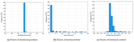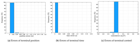 The trajectories generated by Monte Carlo test are shown in Figure 5, and the distributions of the terminal errors are presented in Figure 6. We can see from Figure 6 that the maximum error of position is around , that the maximum error of expected flight time is less than , and that the maximum error of the terminal control command is . Overall, the Monte Carlo test results demonstrate that the proposed method not only achieves high accuracy but also ensures stable and robust performance under uncertainty.