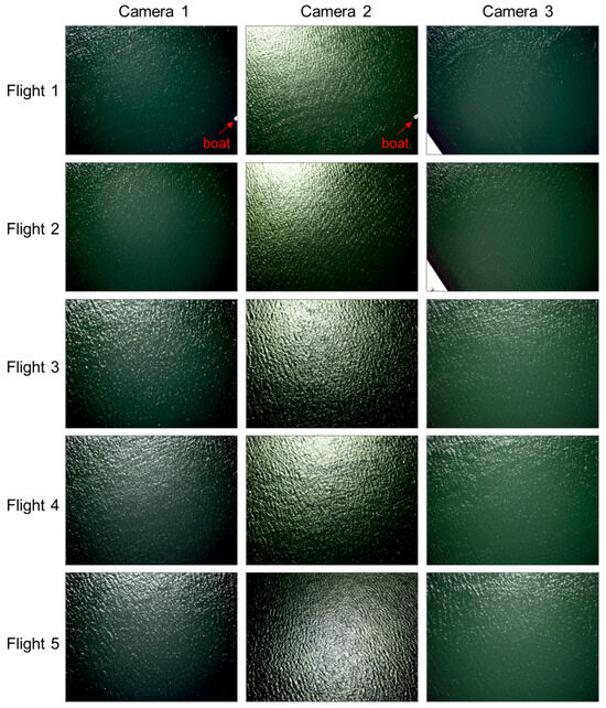 Based on the research of optimal imaging angles for multi-angle SG from Wang et al. [15], five combinations of different flight heights and tilt angles of view were designed (Table 2). The flight commands were set and transmitted to the UAVs. The drones were fully automated during the flight, including the route, flight speed, and camera timed to take pictures. The two UAVs are 50 m apart and conduct the experiment at the same speed and flight direction. The three Survey3N cameras are programmed to capture water surface images at 3-s intervals and collect both RAW data (12 bit per channel) and JPEG images (8 bit per channel). The Survey3N is equipped with a GPS receiver that generates geolocation tags for each image captured. Prior to image processing, Survey3N JPEG images are combined with GPS-tagged RAW images using the MAPIR Camera Control software (version 10162019) to create TIFF files. Survey3N TIFF images are then scaled to reflectance values based on images of the MAPIR Reflectance Reference Calibration Target collected before UAV flights. Figure 2 shows multispectral images (R: 850 nm, G: 660 nm, B: 550 nm) from three cameras for five flights. There is obvious SG signal in the images, but the SG distribution is significantly different for different flight parameters. Each camera of Flight 1–5 contains 32, 34, 35, 32, and 33 images, respectively, with a size of 3000 × 4000 pixels. Images in the near-infrared (NIR, 850 nm) band are used for this study.