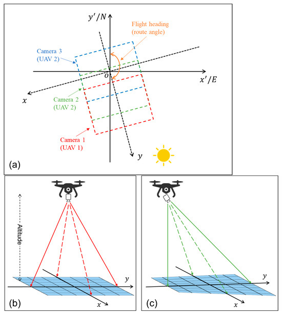 In this study, the angle between the flight direction of the UAV and the north direction is 165°, and the shooting direction of the camera is basically the same as the flight direction of the UAV (Figure 3a). Therefore, a custom heading coordinate system is established using the centre point of the first image captured by Camera 3 as the coordinate origin, the camera heading as the y-axis positive direction, and the vertical camera heading to the right as the x-axis positive direction. At the same time, the GPS receiver records the latitude and longitude of each image. Therefore, the coordinate positions of all images are obtained by converting the difference between the latitude and longitude of the image and the first image into the distance of the customized heading coordinate system using a rotation matrix. The Figure 4a–e illustrate the position of the image of the three cameras of Flight 1, Flight 2, Flight 3, Flight 4 and Flight 5, respectively.