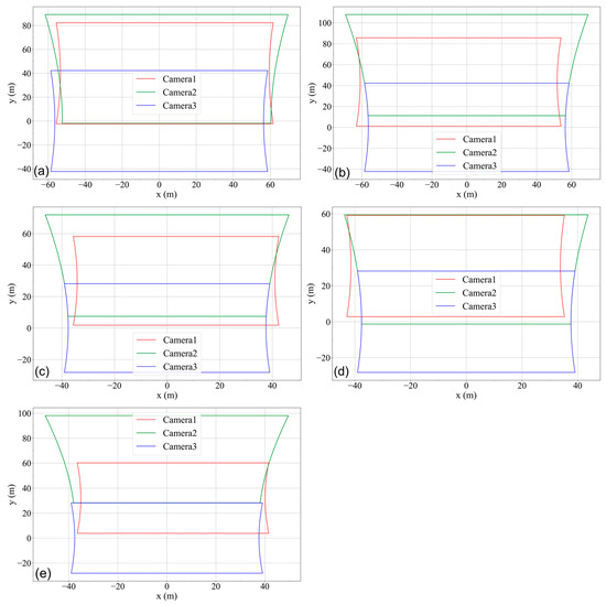 Positions of the images from the three cameras of Flight 1 (a), Flight 2 (b), Flight 3 (c), Flight 4 (d) and Flight 5 (e) after geometric correction and coordinate transformation.