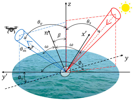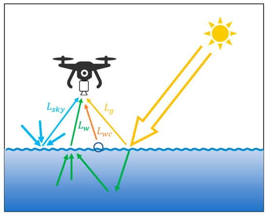 In Equation (1), the effect of the atmosphere is not considered because the sun-surface-UAV observation system is a close-range remote sensing [6,22,23]. Therefore, the effect of the atmosphere between the sensor and the water surface is neglected.