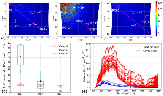 NIR band radiance image from Camera 1 (a), Camera 2 (b), and Camera 3 (c) of Flight 1 at the same time. (d) Total radiance from three ROI labelled in (a–c). (e) water surface radiance and sky light radiance measured by the spectrometer.