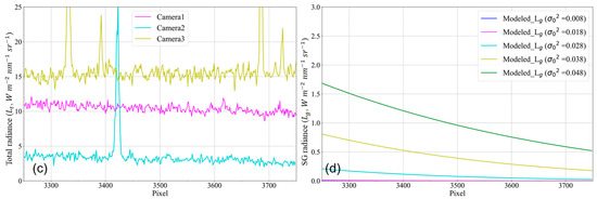 A continuous radiance profile is derived along the “Profile” line in Figure 7a–c, and these data are plotted in Figure 8a. Along the “Profile” in Figure 7b, we extract the geometric angle of each pixel. Then, we set five roughness values, i.e., = 0.008, 0.018, 0.028, 0.038, and 0.048. Using Equation (2), we simulate the SG radiance with different roughness values (Figure 8b). A portion of the image is enlarged to show the contrast between the radiance of the SG-free area image and the modelled SG radiance (Figure 8c,d). We can see that the radiance of the image in the SG-free region is about 3 to 5 () higher than the simulated one.