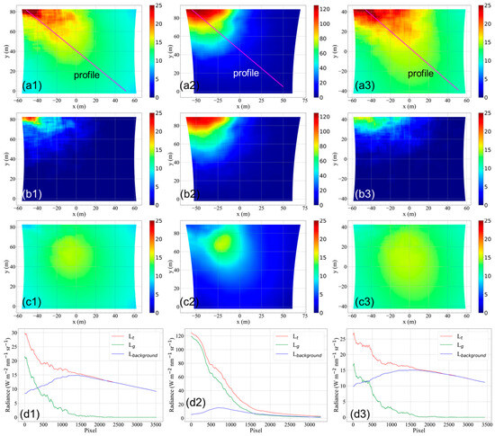 Images from Cameras 1, 2, and 3 with a resolution of 10 m. (a1–a3) Total radiance; (b1–b3) SG radiance; (c1–c3) Background radiance. (d1–d3) Radiance profile along the purple line labelled ‘Profile’ in (a1–c3), which shows the variation in total radiance, SG radiance, and background radiance.