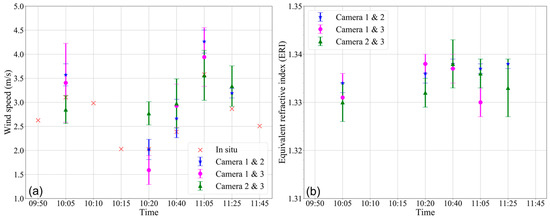 Statistical analysis of estimated wind speed (a) and ERI (b) of different camera combinations from different flights. The x-axis represents the flight time.