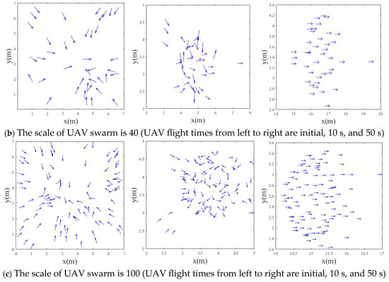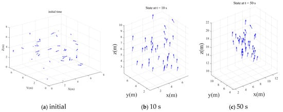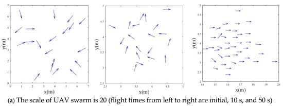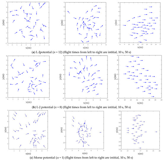 Figure 10 illustrates the swarm’s configurations at discrete time instances, where arrow orientations denote the velocity directions of individual UAVs.