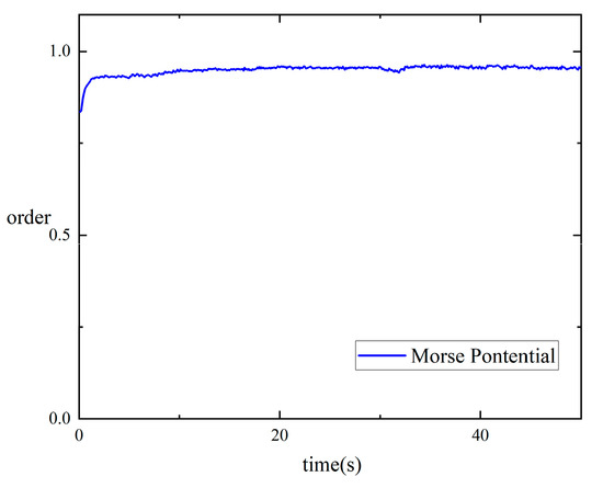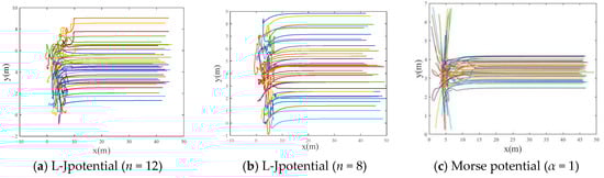 Figure 9 shows the variation curves of the ordinal coefficients of the L-J potential and Morse potential function at different UAV scales. During the simulation, it was found that although the Morse and L-J potential functions effectively avoid collisions under normal conditions, they fail to converge to the equilibrium distance in extreme scenarios (such as dense swarm conditions). Moreover, as the swarm scale increases, the UAV density increases, causing the equilibrium distance to be smaller than the preset value.