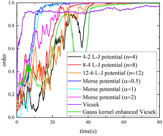 The number of the UAV swarm is fixed at 40 to verify the effect of different potential functions on the consistency of the swarm. Different powers of the Lennard-Jones potential function (